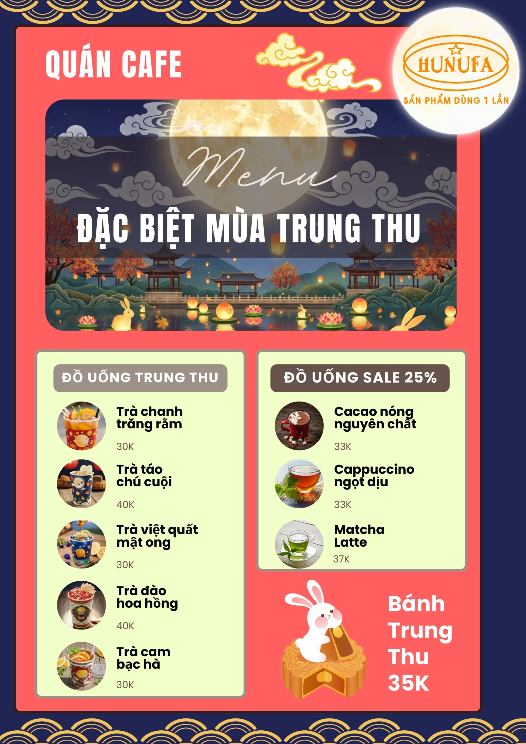 Một cách hay để gây ấn tượng với khách là thay đổi menu theo từng mùa hay dịp lễ hội. Chẳng hạn như vào dịp Trung Thu, bạn có thể thêm họa tiết lồng đèn, trăng rằm và bổ sung thêm các loại đồ uống Trung Thu để menu trông thật gần gũi và ấm áp. Khi thời tiết se lạnh, việc gợi ý menu đồ uống mùa đông cho quán cafe cũng giúp khách thấy được sự tinh tế và chu đáo của quán.