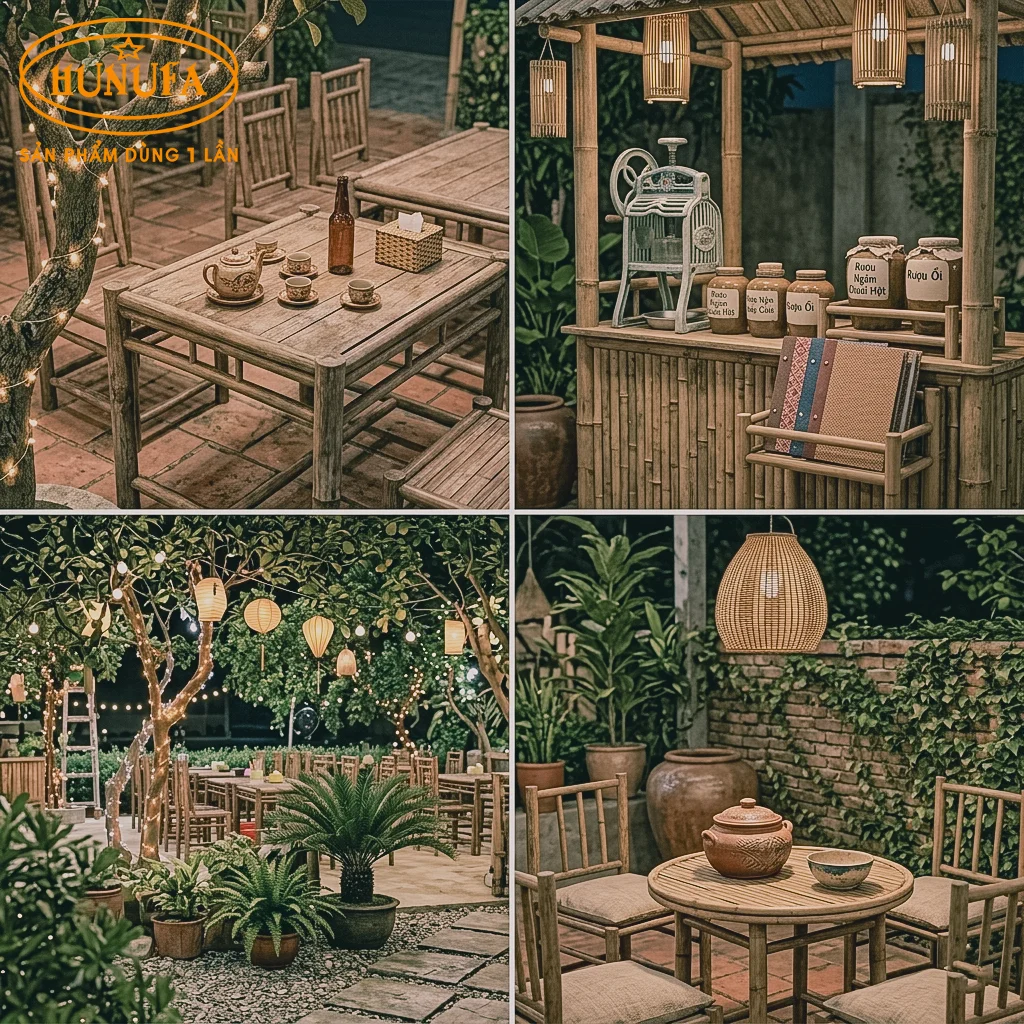 Tận dụng tối đa cây xanh, dây leo, chậu cây cảnh và tiểu cảnh tre, nứa. Bàn ghế bằng mây, tre hoặc gỗ tự nhiên, mái che bằng lá dừa hoặc tấm nhựa giả tranh. Ánh sáng vàng nhẹ từ đèn lồng giấy hoặc đèn năng lượng mặt trời. Kiểu trang trí quán nhậu nhỏ này mang lại cảm giác thư giãn, mát mẻ.