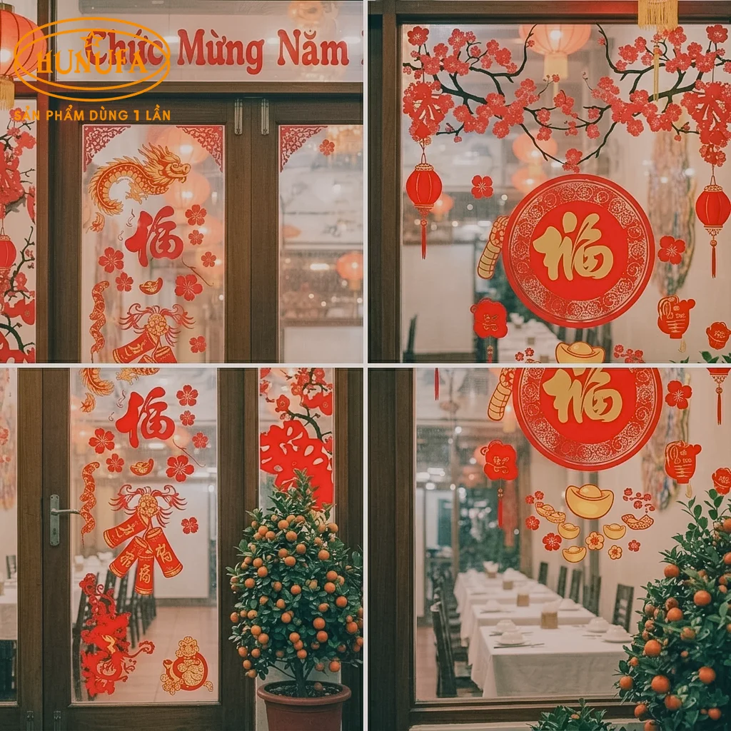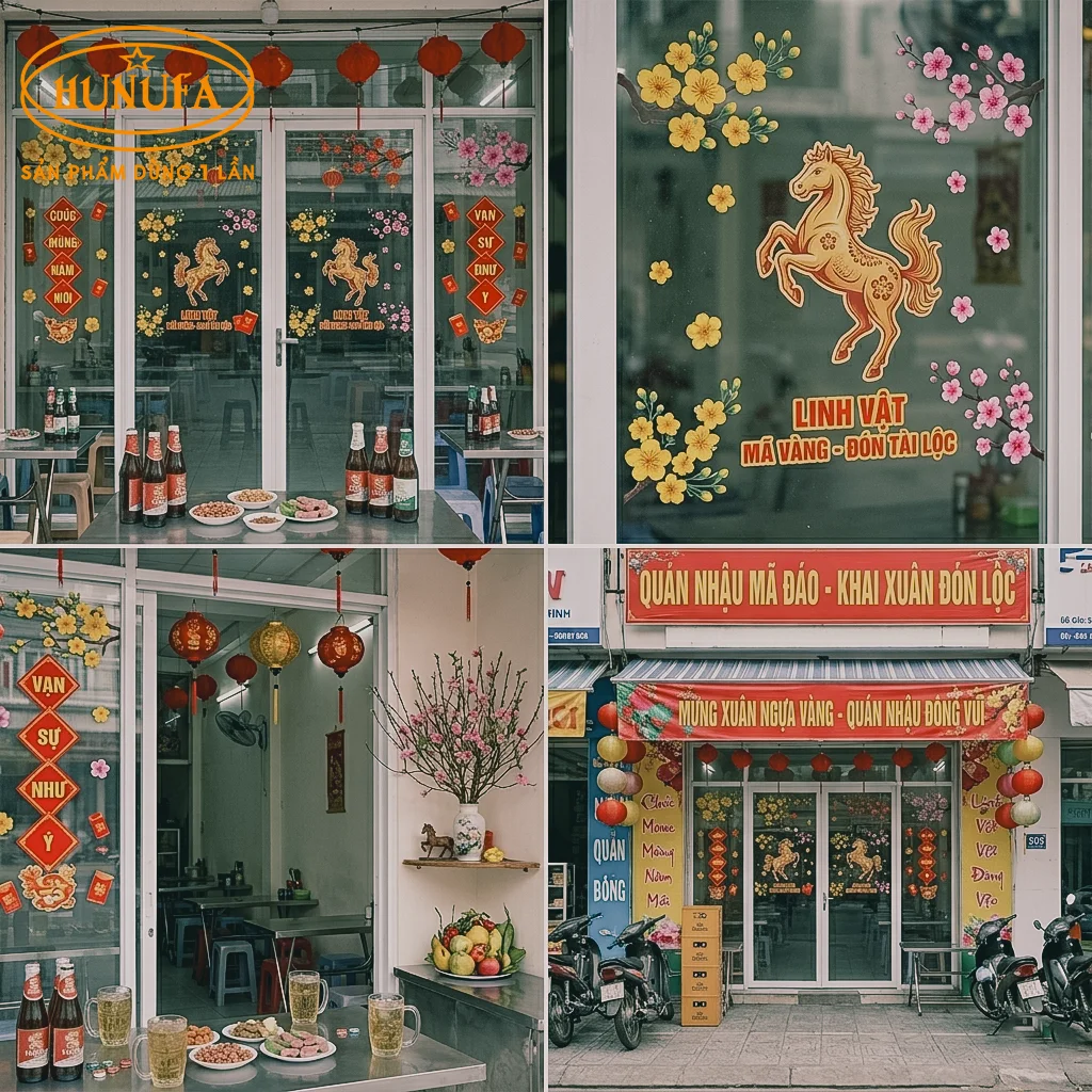 Decal Tết là lựa chọn tiết kiệm chi phí, dễ thi công nhưng hiệu quả cao. Các mẫu decal câu chúc năm mới, linh vật, hoa mai – hoa đào giúp cửa quán nổi bật hơn, thu hút ánh nhìn của khách từ xa, đặc biệt phù hợp với quán nhậu mặt tiền đường lớn.