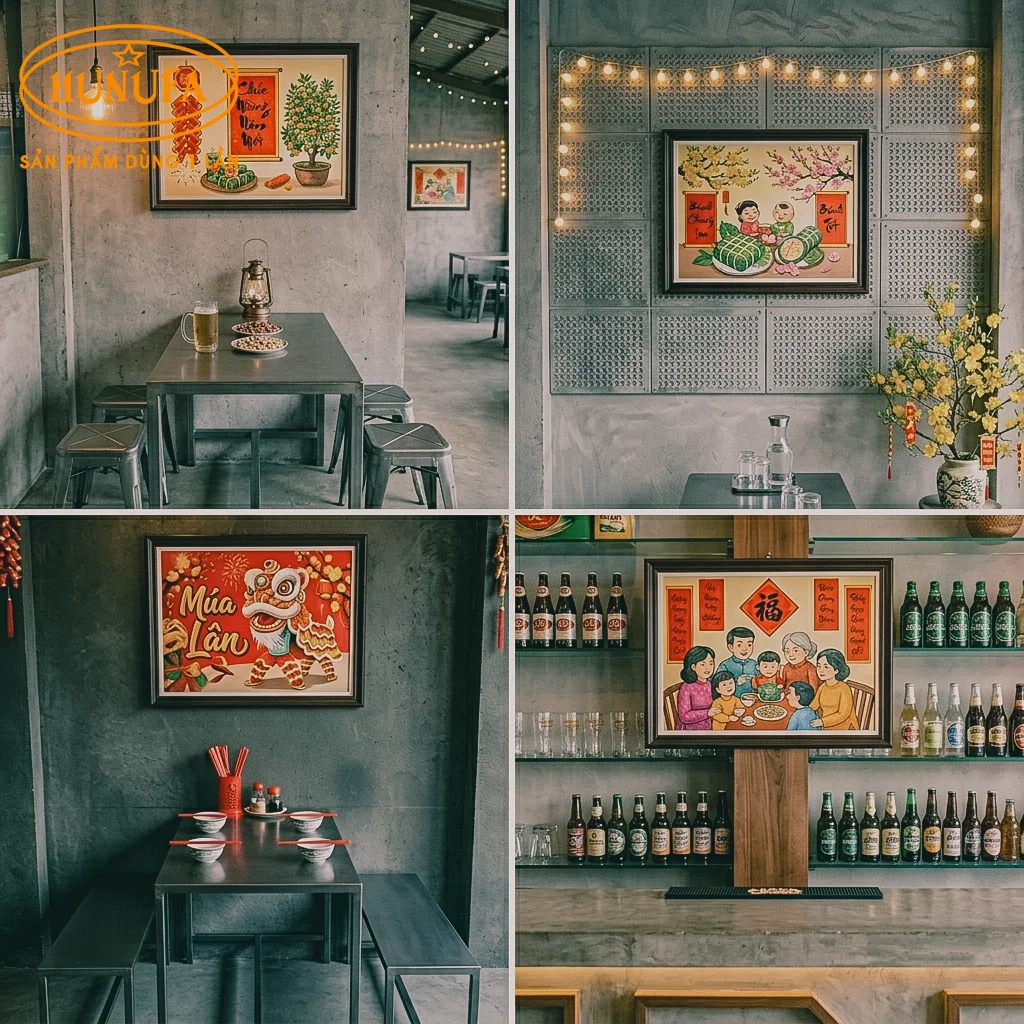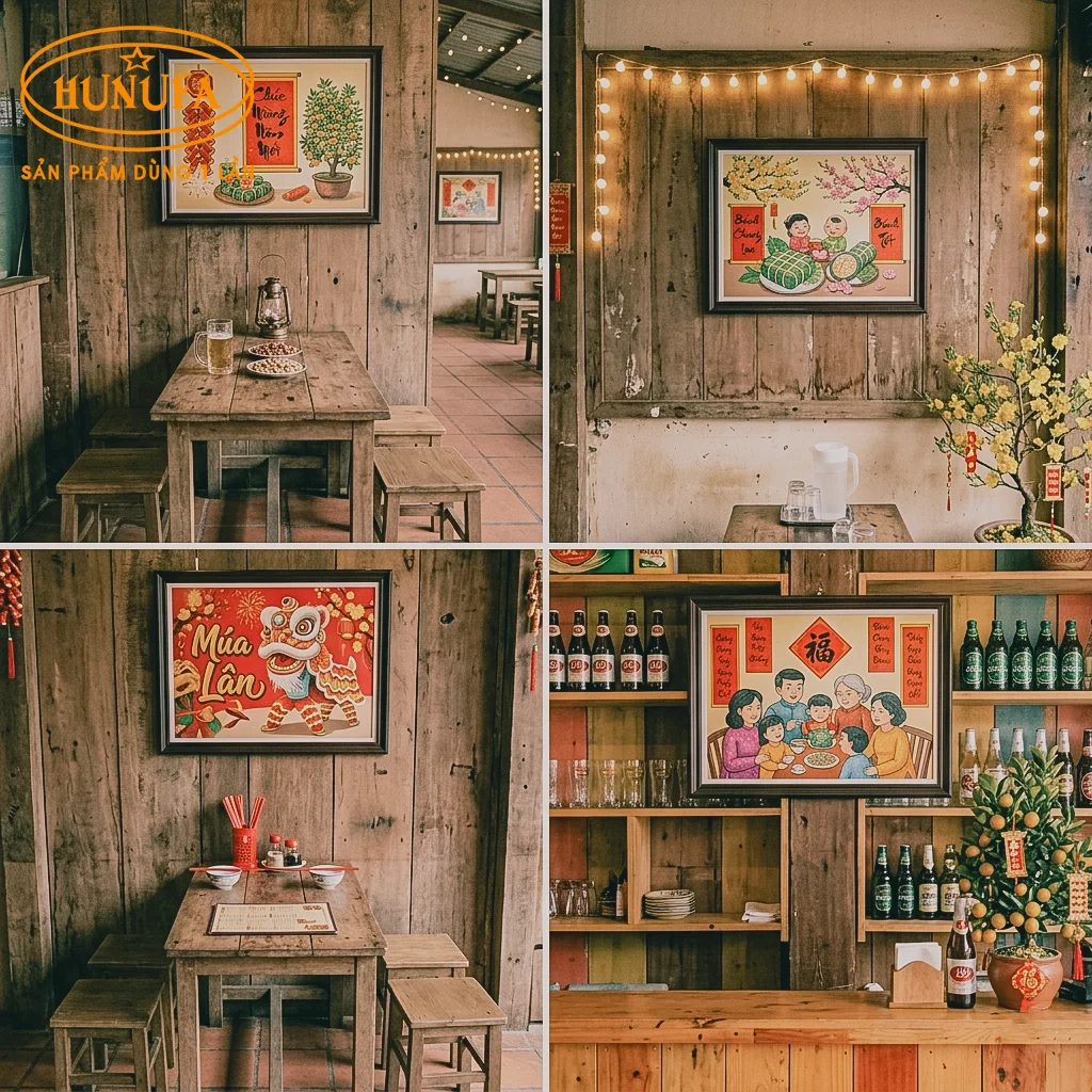 Tranh Tết là vật trang trí đơn giản, dễ thay đổi và có thể dùng hàng năm. Bạn nên chọn tranh Tết có kích thước vừa phải, hình ảnh quen thuộc vào ngày Tết để không gian quán nhậu đồng nhất nhưng không bị rối mắt.