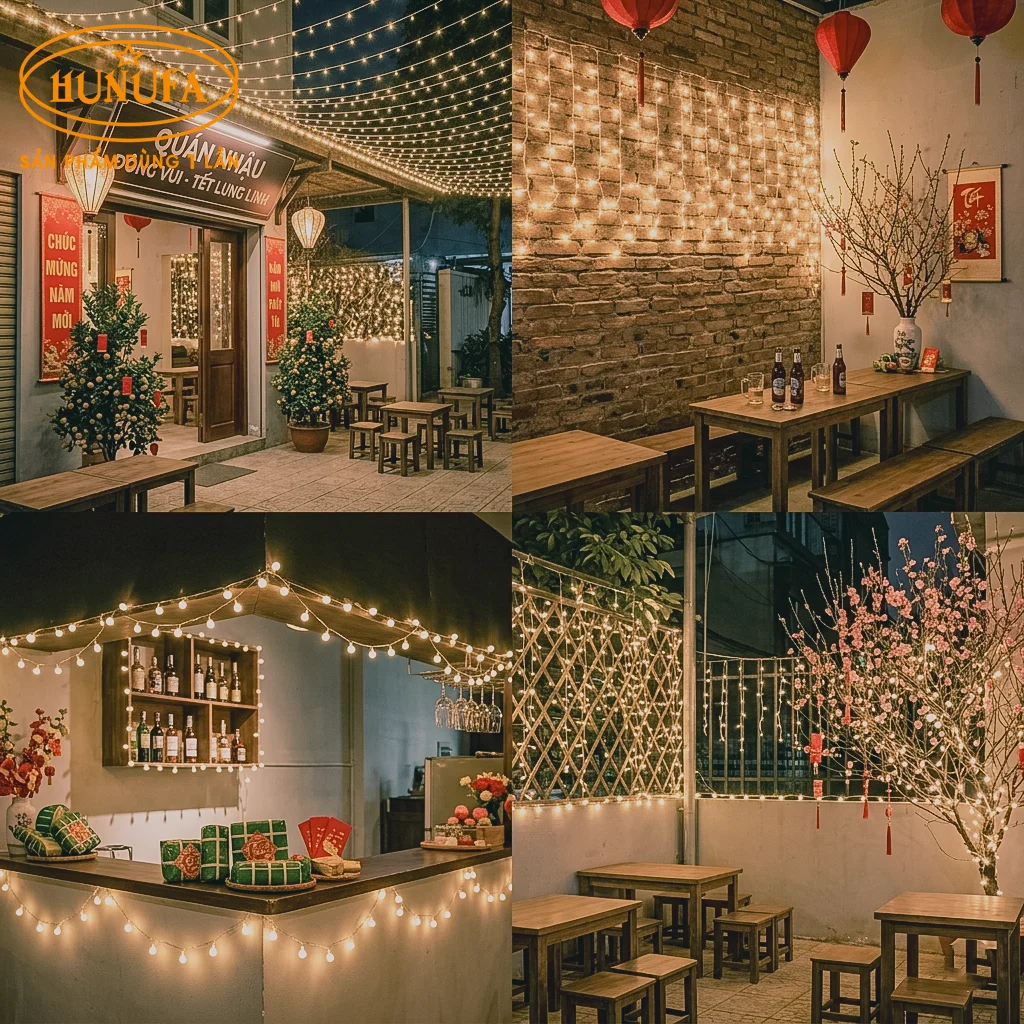 Dây đèn LED ánh vàng hoặc đỏ giúp quán nhậu trở nên ấm cúng hơn vào buổi tối. Có thể treo dọc tường, khung cửa hoặc khu vực ngoài trời để tạo không gian Tết lung linh mà không tốn quá nhiều chi phí điện.