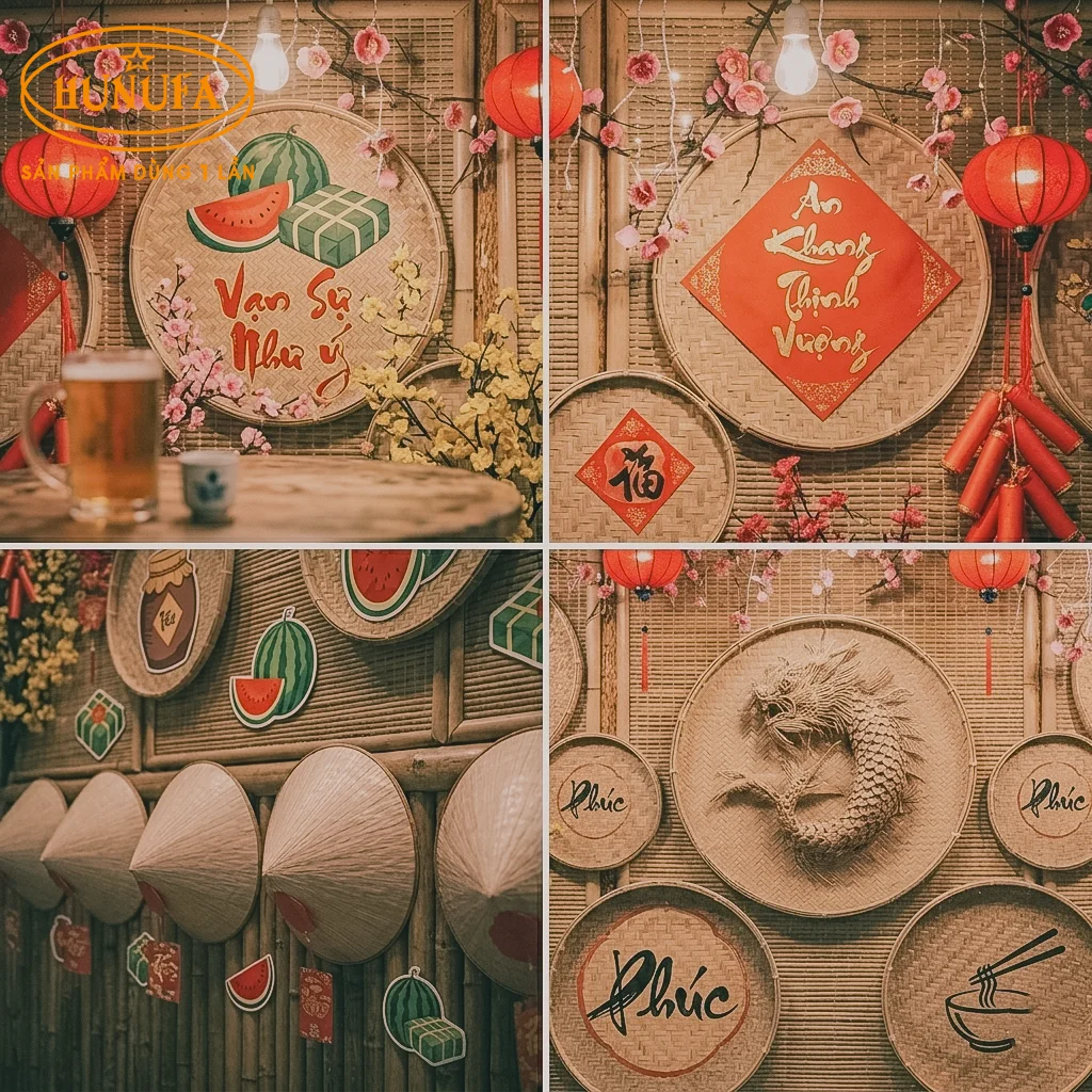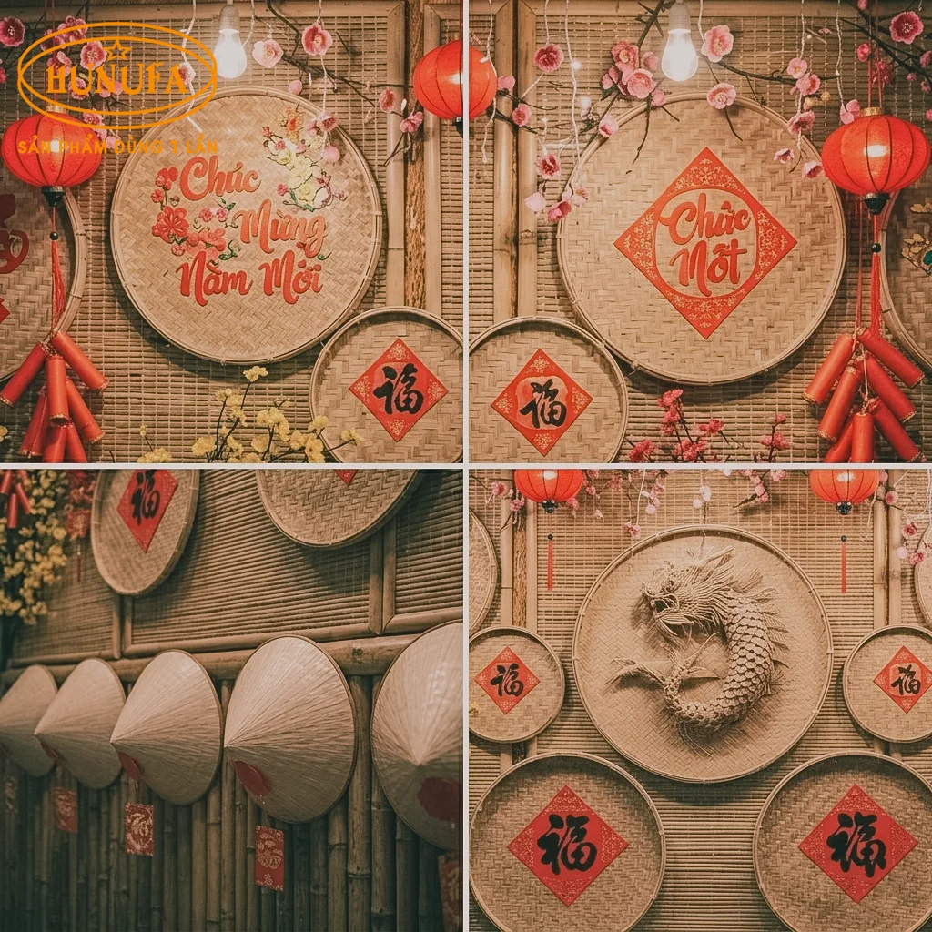 Trang trí tường bằng mành tre hoặc mẹt tre chủ đề Tết